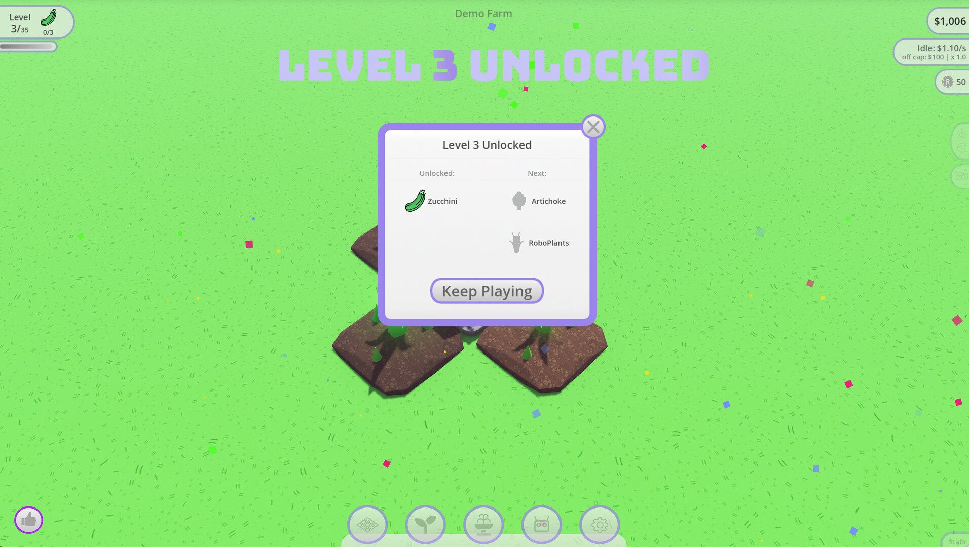 Unlock unique produce, decorate your land with custom creations, and watch your income soar. Use top-down mode to build and design your farm more effectively. With top-down mode, you have a clear view of your farm. Easily construct paths, harvest plants, and enjoy the view. Then upgrade, automate, and keep pushing your farm’s value higher. The demo version limits you to 100 dirt tiles for planting your veggies.