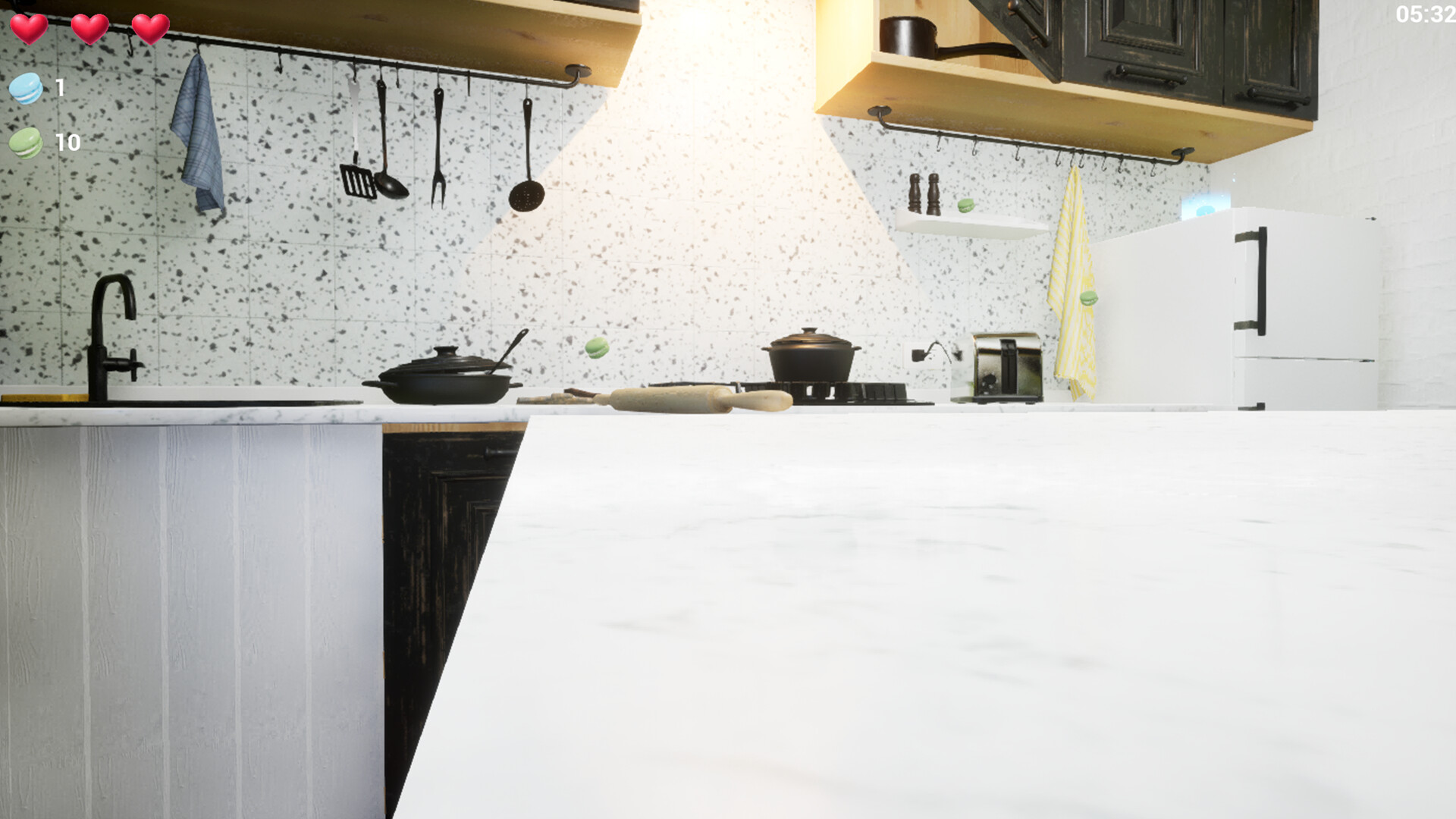 • Mysteries Hidden in the House: A cluttered room, bloodstains on the wall... As you search for macarons, you will encounter strange traces that hint at what happened in this house.