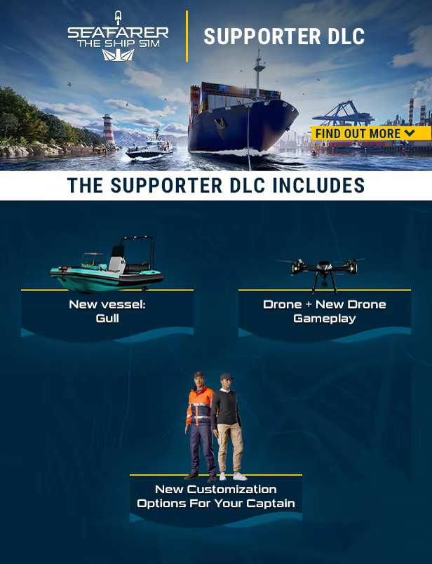 If you’d like to actively support the ongoing Early Access development of Seafarer, the Supporter DLC is a great way to do so. By purchasing it, you’re directly helping the team shape the ship simulation they’re passionate about. As a thank you for your support, you’ll receive the new vessel “Gull”, complete with our first-ever drone gameplay, plus a selection of cosmetic items to personalize your captain's appearance. A small bonus for you and a meaningful contribution to Seafarer’s journey ahead.