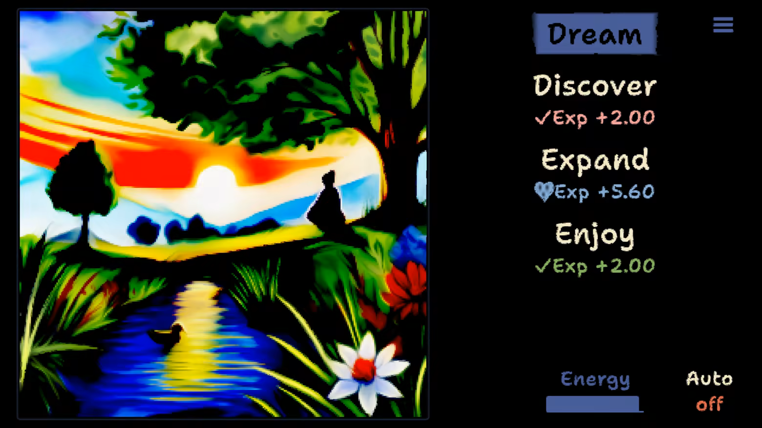 A meditative incremental simulation where you interact with dreams in four phases: discover, expand, enjoy, and release. Each phase offers unique mechanics that go beyond simple clicking, requiring concentration, engagement, and optimization.