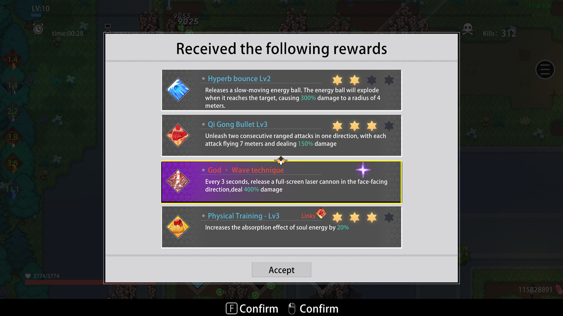 The game uses the most traditional survivor gameplay: defeat monsters, collect experience, upgrade and choose skills. Combining main and secondary skills can create powerful ultimate attacks.