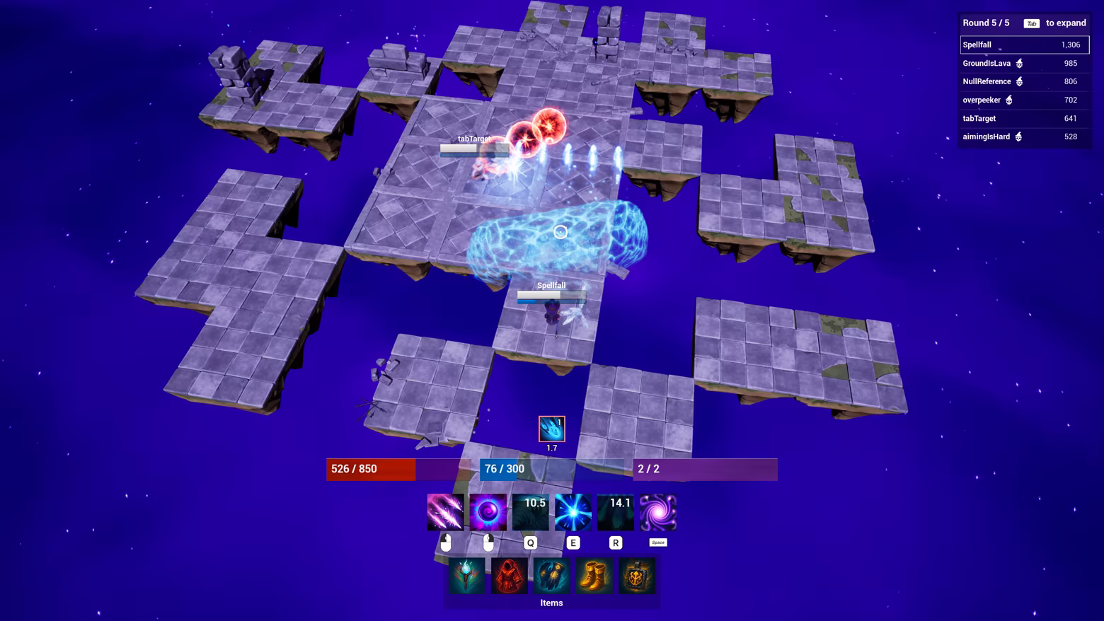 Spellfall: Last Mage Standing is a fast paced top-down arena brawler where 6 mages draft spells and items across 5 rounds, battle on a collapsing magic infused arena, and fight to be the last mage standing.