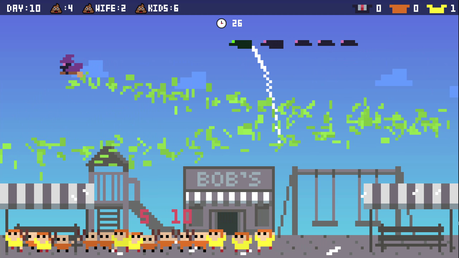 A chaotic 2D arcade game where you play as a crow dropping poop on people below, sending them to the laundromat, earning rewards, and unlocking new abilities across days and multiple locations.