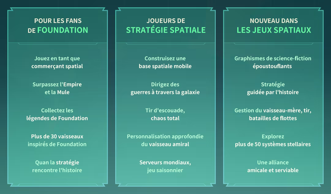 EMBARQUEZ DÈS MAINTENANT !Dans l'univers de Foundation :Écrivez votre légende de science-fiction • Construisez le vaisseau amiral de vos rêves • Développez des réseaux commerciaux • Commandez des flottes d'élite • Forgez votre destin galactique !