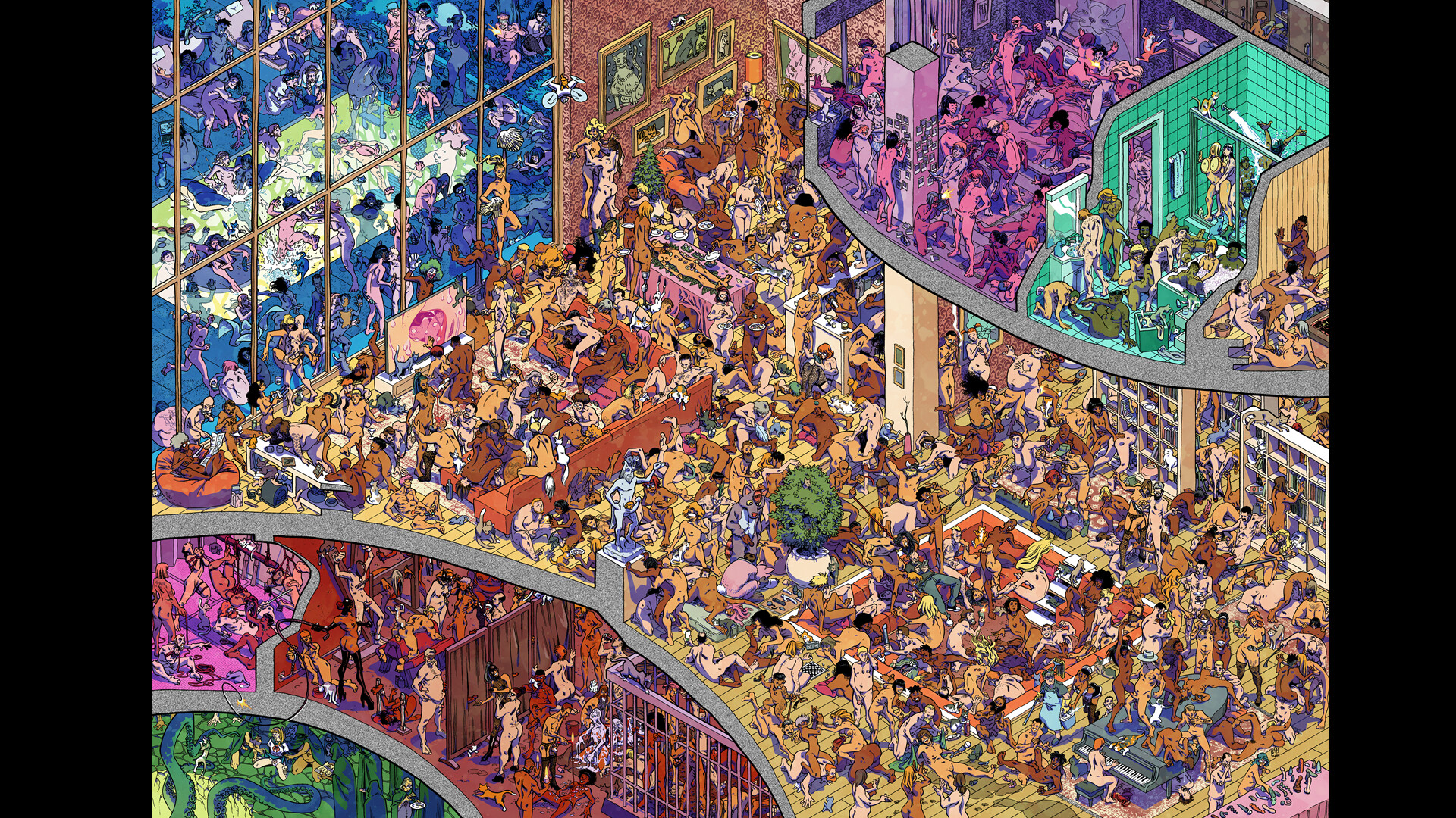 This game contains explicit sexual content and full-frontal nudity. It depicts a large, comedic orgy scene featuring a wide variety of consensual sexual acts between multiple adults of diverse genders, orientations, and body types.