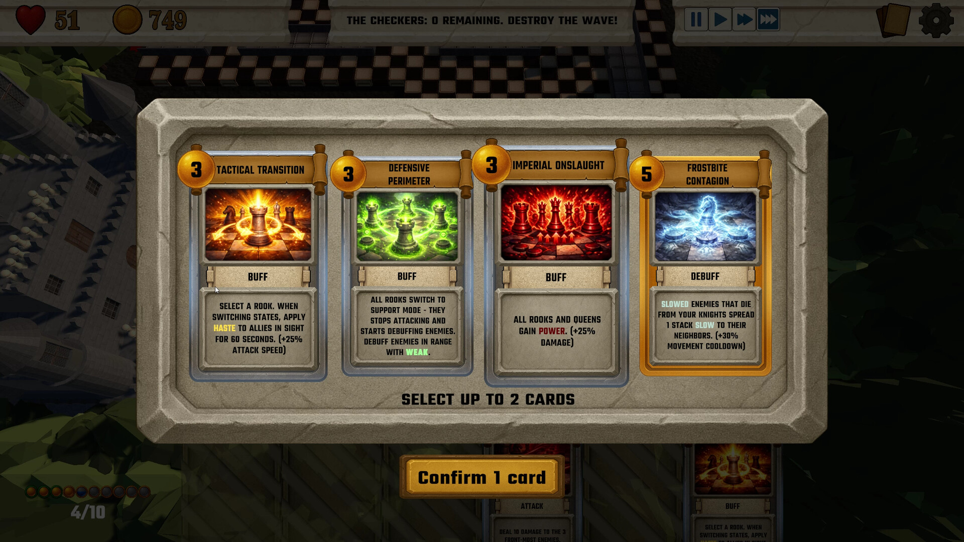 A tactical tower defense roguelike game where chess pieces defend against waves from other games. Place strategic pieces, play powerful cards, build synergistic decks, and survive procedurally generated runs of increasing difficulty.