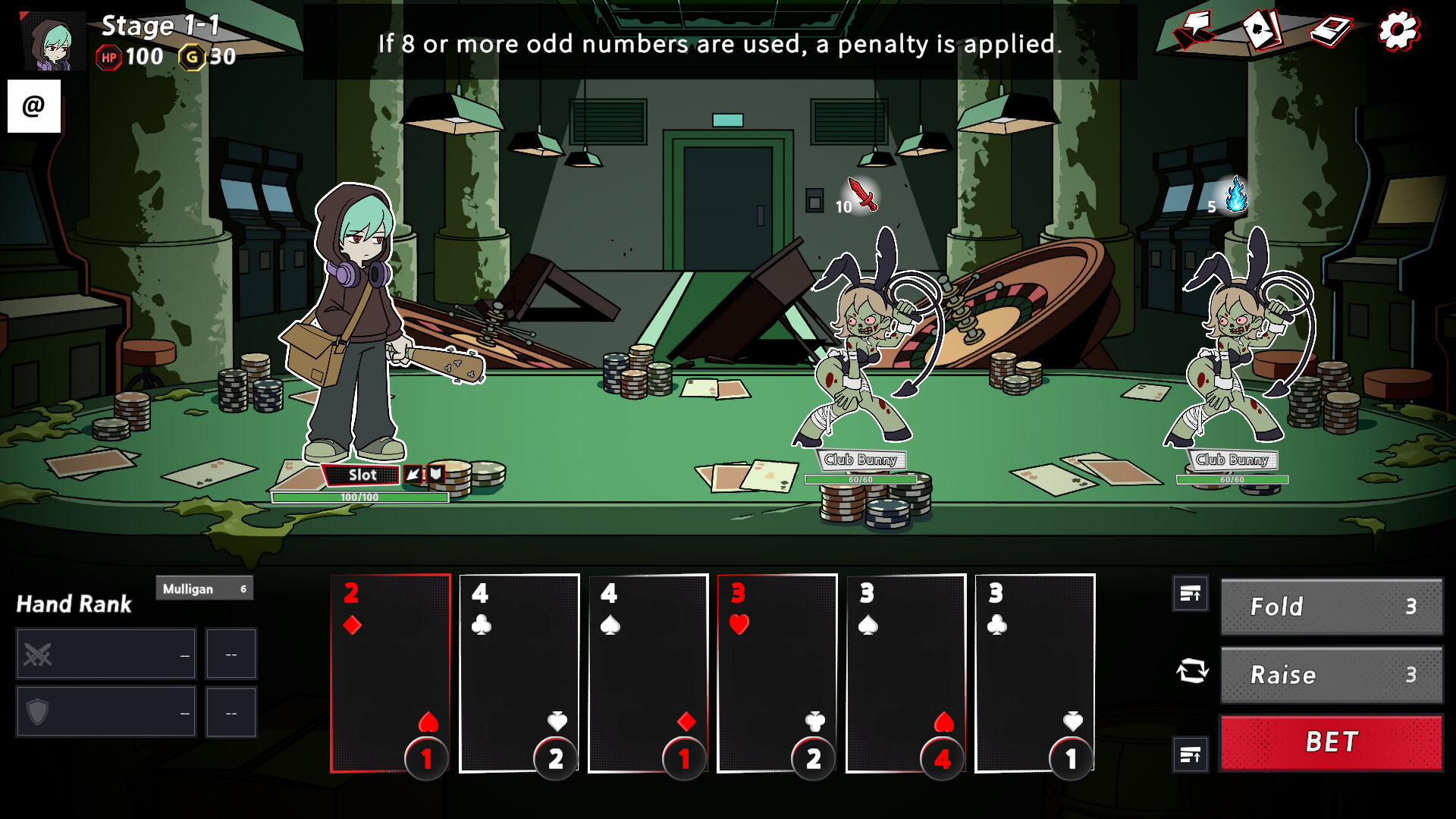 Use dual-faced cards to build two hands each turn and shift the battle in your favor through the synergy of equipment and jokers.