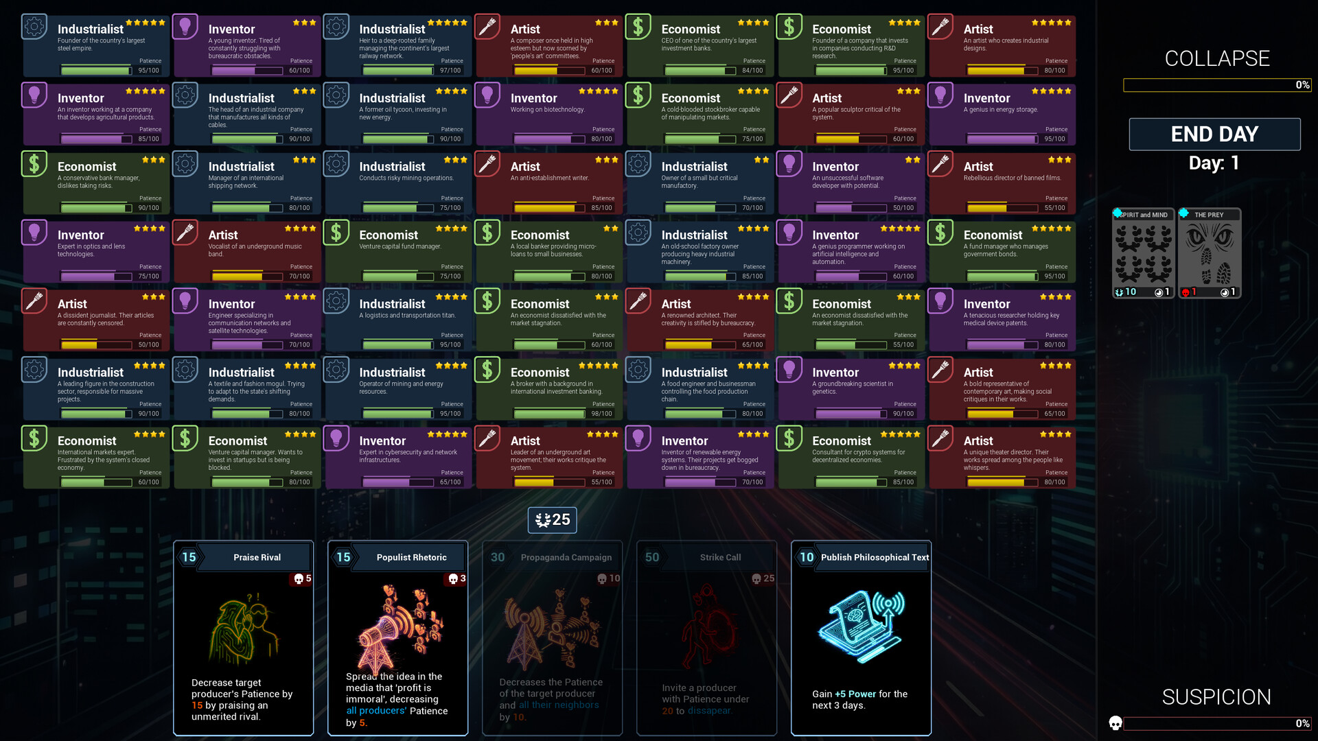 A card-based ideological collapse simulation game. Infiltrate the system, use bureaucracy and taxes as weapons. Wear down producers' patience to stop them from producing. Bring down the system.