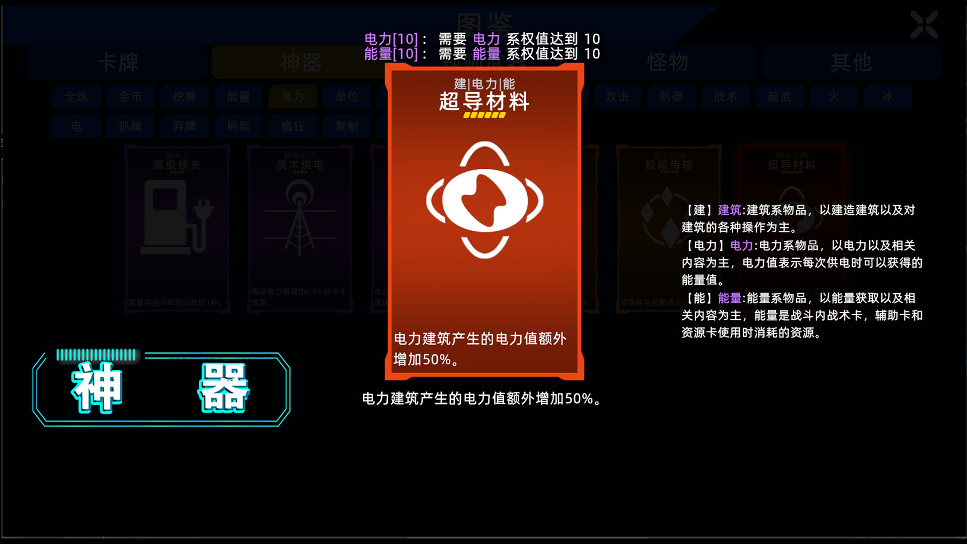 • 神器:可以提供被动加成。神器类似于卡牌,根据玩家的选择不同会获得不同的构筑路线。神器的获得有随机性,但是神器能提供远比科技强大而又丰富的加成。
