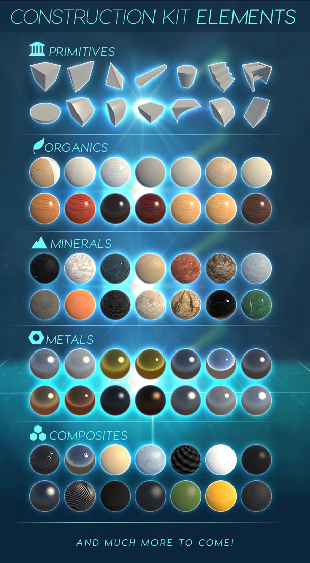 The Metaverse Construction Kit is a virtual environment to construct your own 3D creations. Build anything you can think of using the twenty-four structural elements, and the soon to be released mechanical and technical elements. Make your creations in any style with sixty-four material types like organics, metals, minerals, and composites. And when you're done, publish them to the workshop for others to build upon or from, and for players in the parent Metaverse universe to incorporate into their planetary settlements.