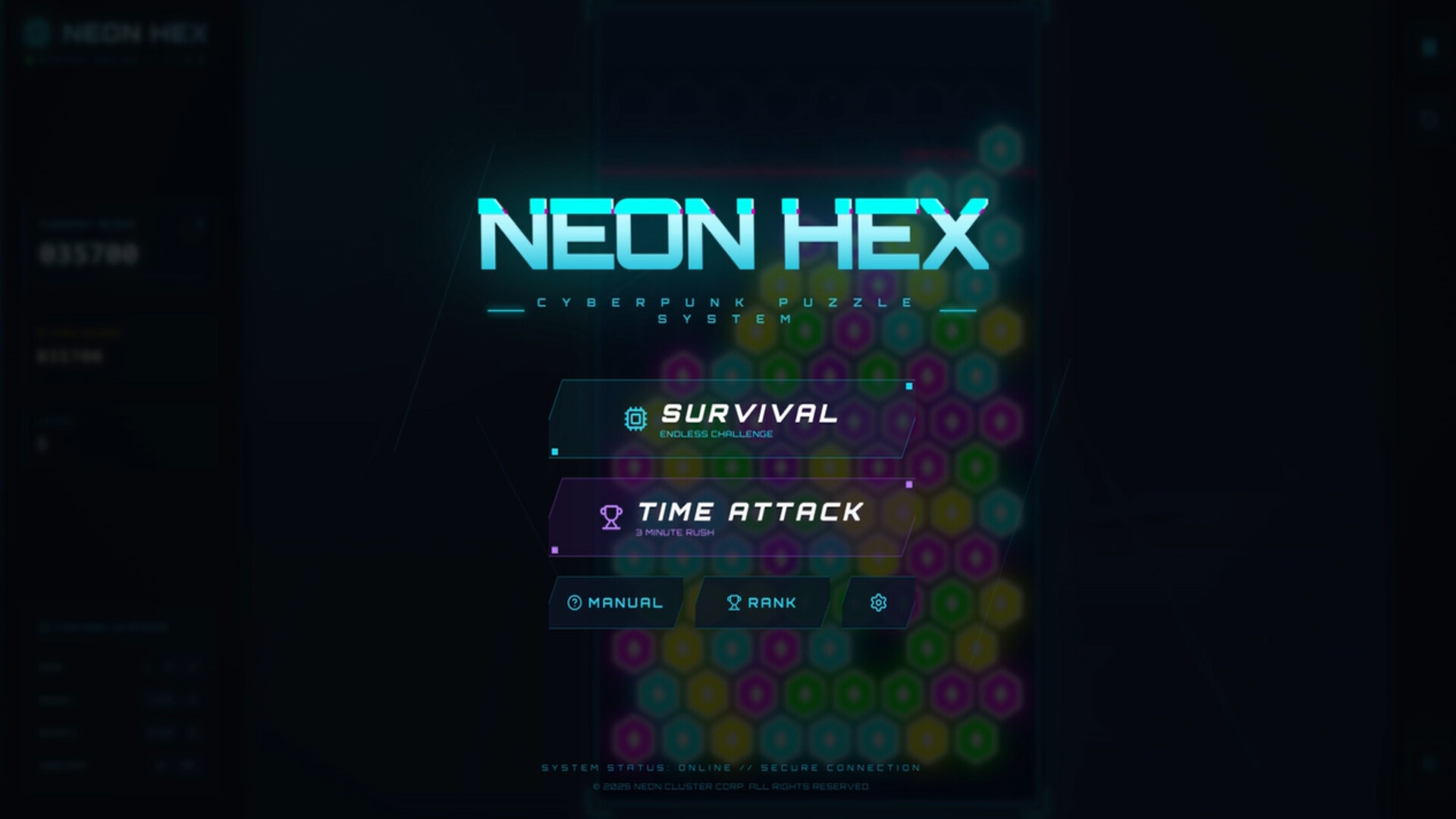 NEON HEX is a stylish hexagonal puzzle game that fuses cyberpunk aesthetics with classic puzzle mechanics.