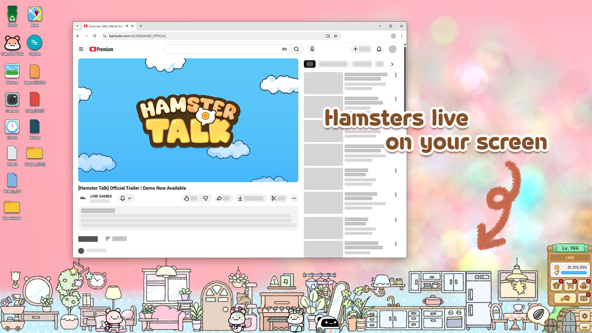Raise hamsters on your screen while using your computer. Gaming, homework, or work—adorable hamsters are with you every moment. "Hamster Talk" is an idle social game that coexists on your screen without interruption. Interact with reactive hamsters, chat worldwide, and grow your own little town!