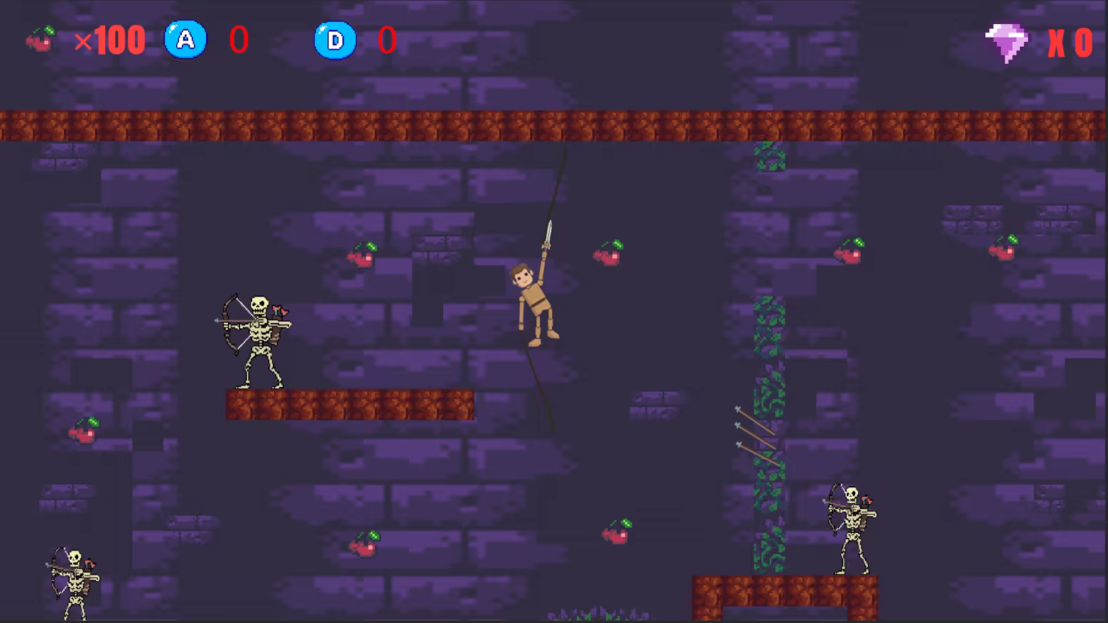 Cherries must be collected directly by the character (not by the ropes). Picking up a cherry restores the player's HP.