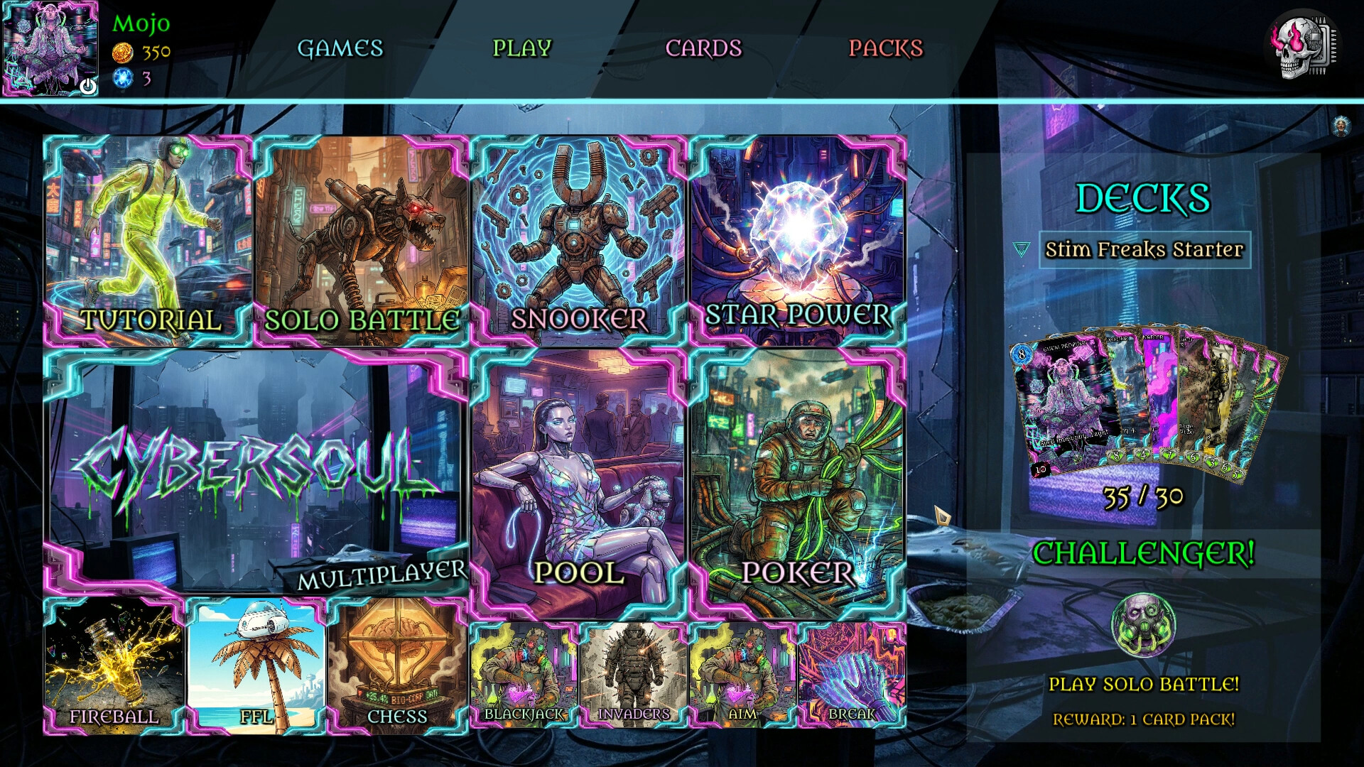 Cybersoul is a realm where strategy meets static, and humanity meets hardware. Overclock your deck, exploit the code, and engage in neon-soaked battles against the worst the future has to offer. Easier to learn than a firewall, harder to master than the stock market.