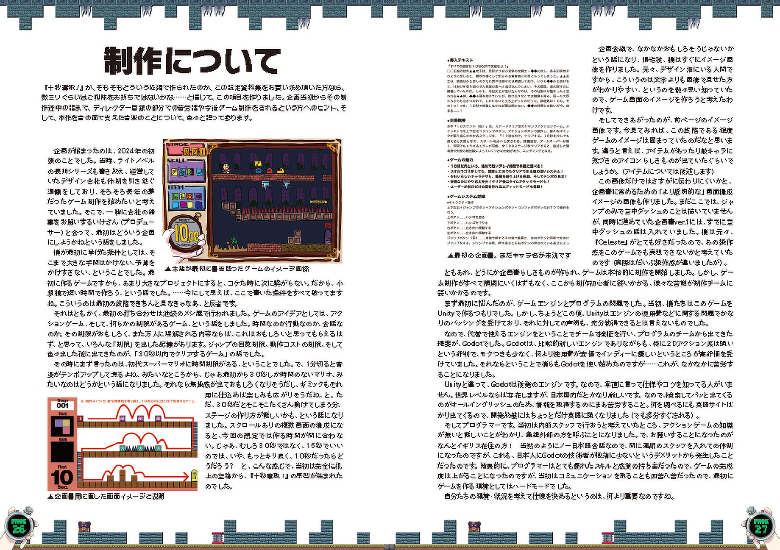 This is the setting materials collection for 10 seconds dash!. It features illustrations, rough sketches, dot graphics used in the game, reference materials employed during production, and accompanying explanations. The main text spans 28 pages, totaling 32 pages.