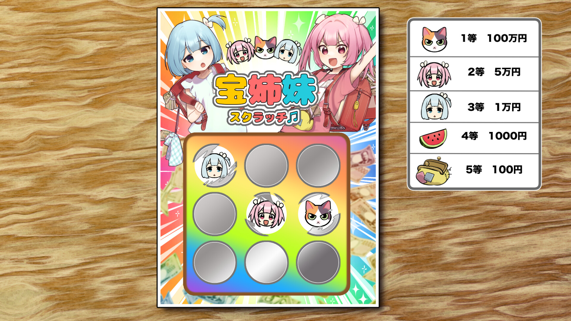 ヤングガンガンで連載中のハートフルマネーコメディ漫画『宝姉妹』のキャラクターたちと一緒に、スクラッチくじ気分を味わえるシミュレーションゲームです。