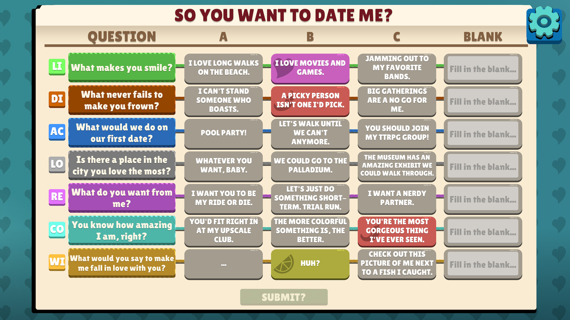 Build up your deck of dialogue choices in order to be the most effective speed-dater. If you want to get your opponent to fall in love first, you'll need to stock up on truly appetizing phrases and opinions to woo them before you can fall hopelessly in love yourself. You'll build a deck, play cards that match the conversation topic, and increase your opponent's affection.