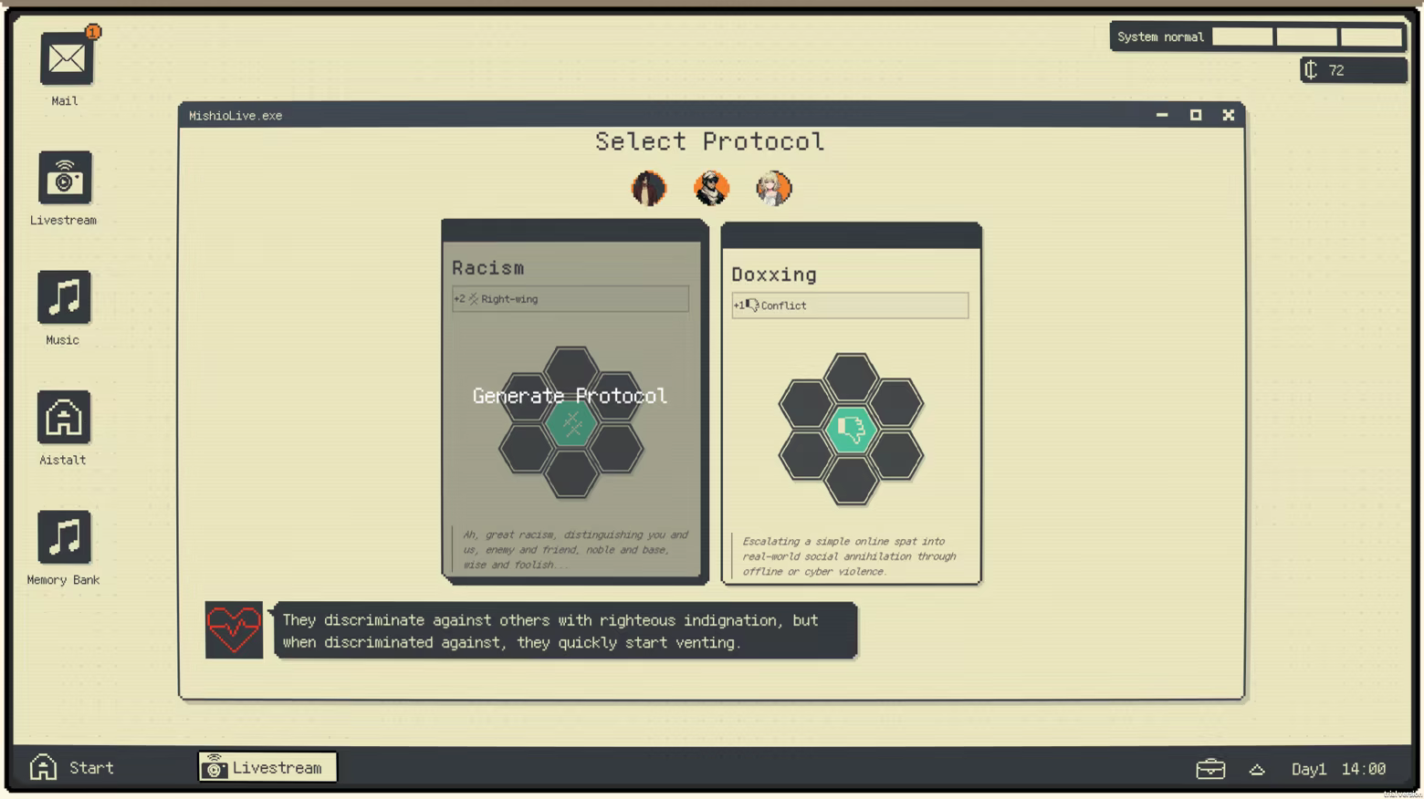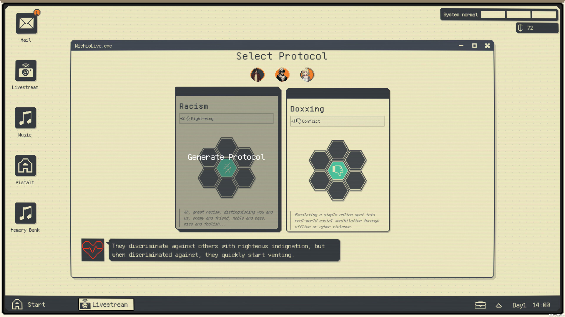 Take charge of Aistalt, a new-created AI, and connect her to internet to study humanity. But beware: the web is toxic with trolls and bait. Navigate carefully, or the platform administrators will permanently ban her.