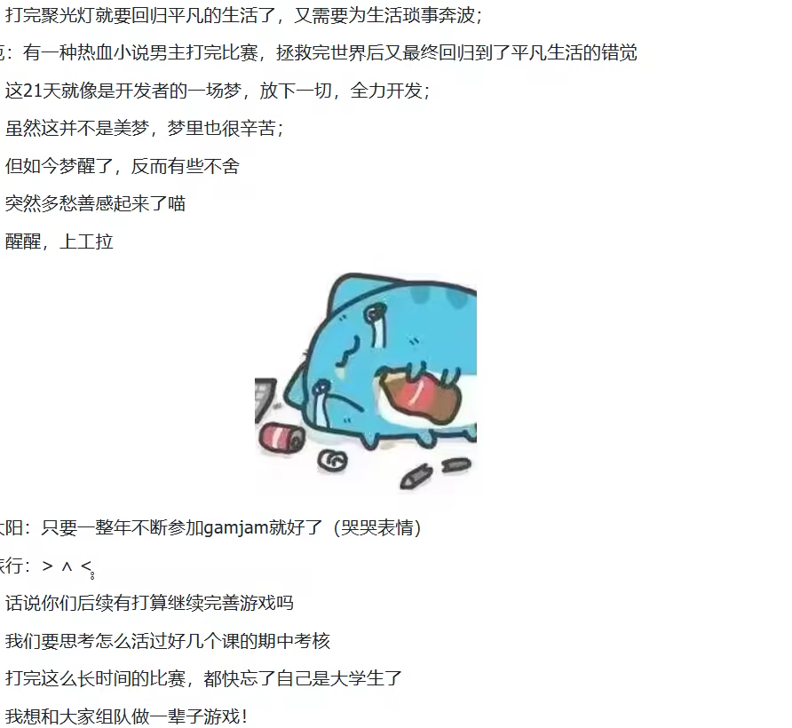 It's the "Need a pro to carry me!" during team formation, the collective brainstorming after the theme reveal, the mutual despair during late-night debugging, the meltdown moments of designers clashing, artists vanishing, or programmers deleting repositories… It's also the sudden catgirl memes, the surreal reality of taking loans to make games, and the digital camaraderie summed up by: "We talk about everything except the game."
