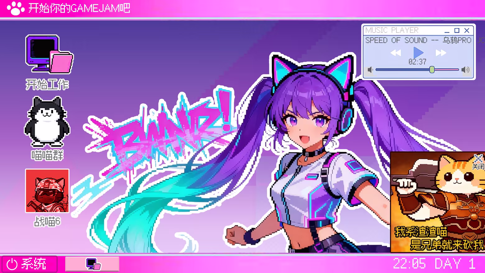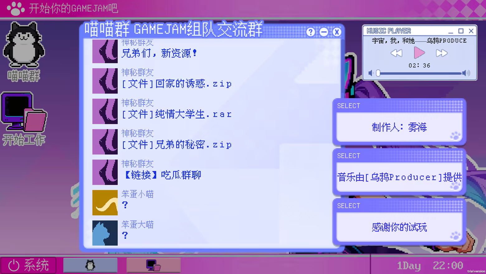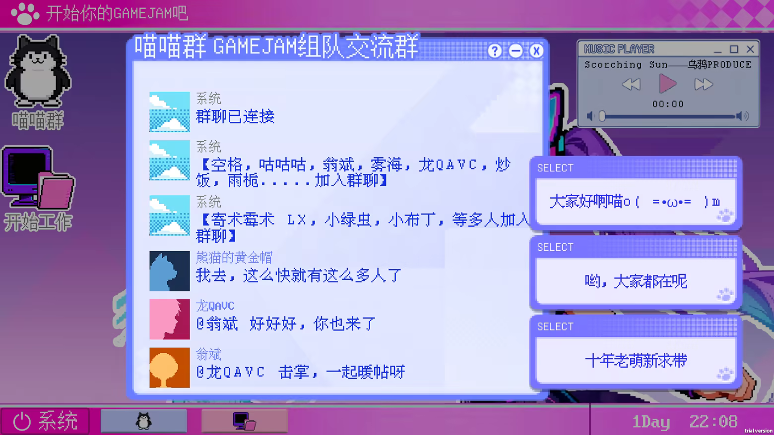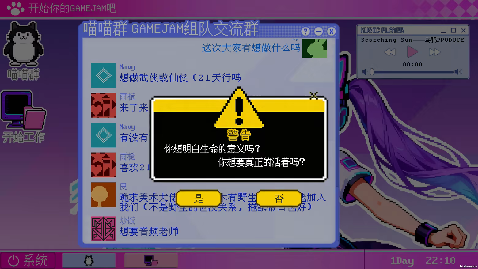 This isn't an ordinary chat group. This is a 1:1 accurate simulation of the entire 21-day Game Jam (time-limited game creation competition) process. You will play as a contestant and personally experience all the "wonderful" moments from team formation, to development, to the pre-deadline breakdown, and finally to the post-competition celebration.