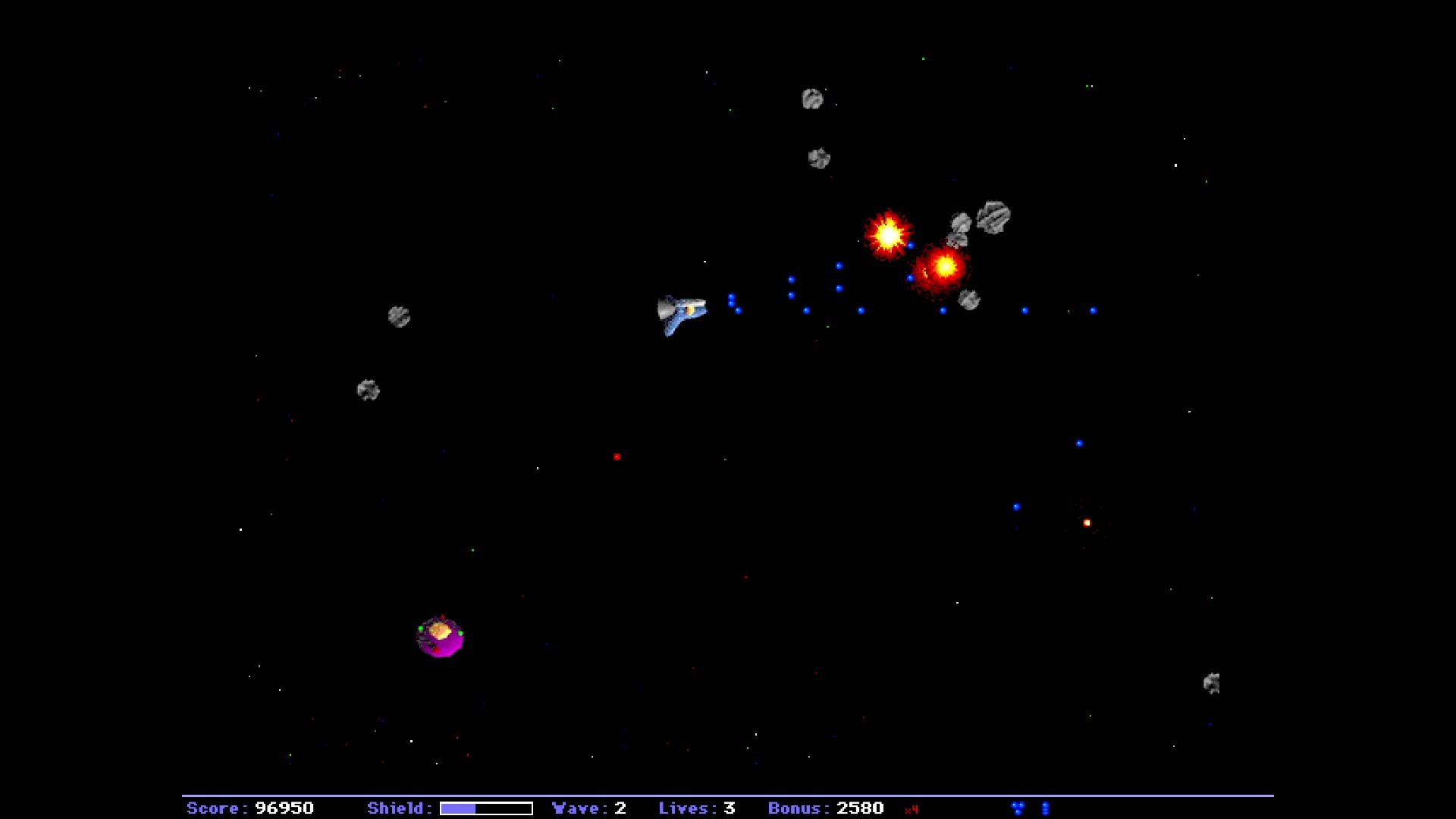 You pilot your ship through the dreaded "Maelstrom" asteroid belt -- suddenly your best friend thrusts towards you and fires, directly at your cockpit. You raise your shields just in time, and the battle is joined.