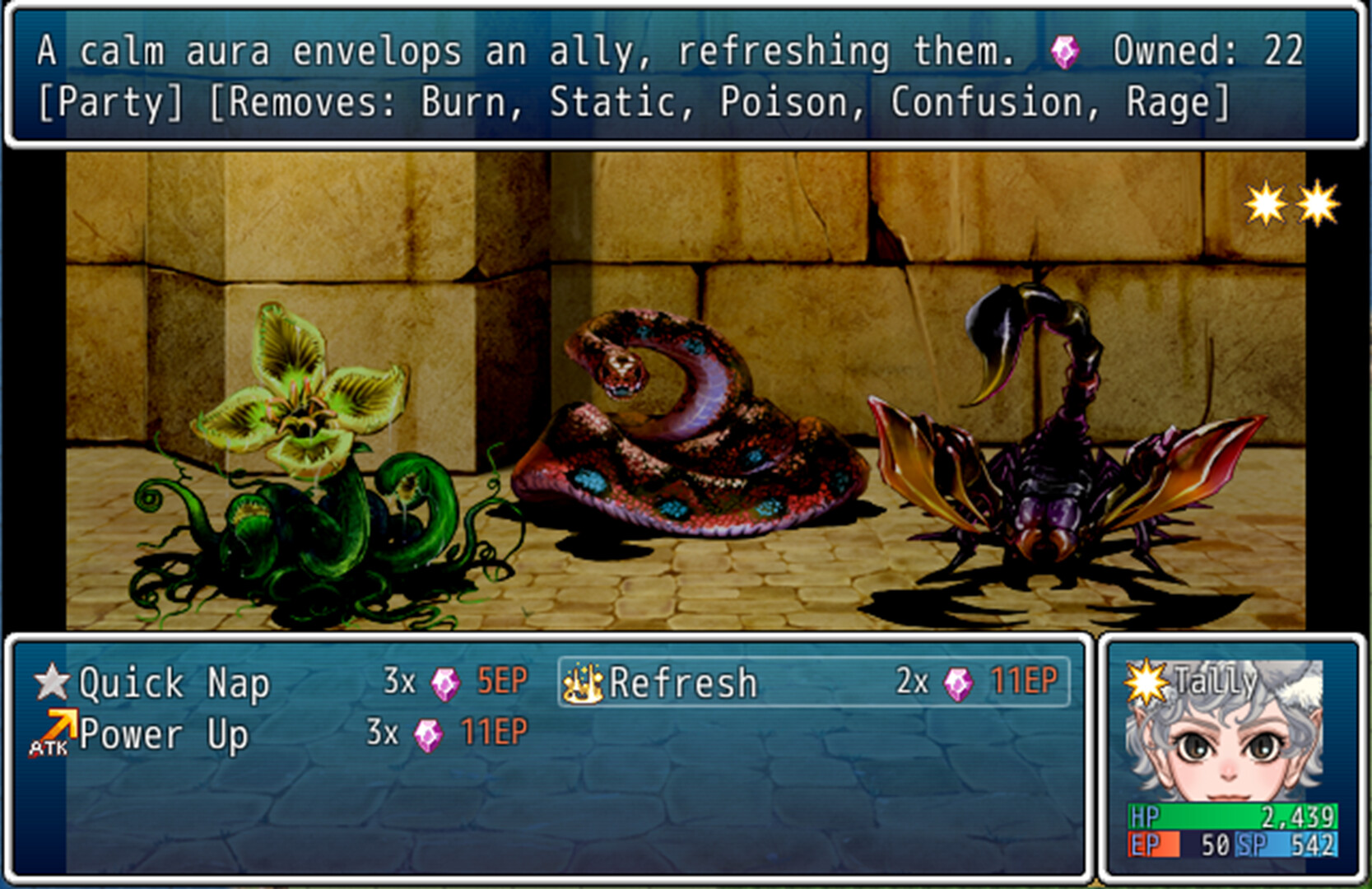 • Every action requires Energy, with more powerful skills requiring more Energy to preform. Characters naturally gain Energy each turn. Equipment can alter this gain, or change the Energy cost of skills. Find the perfect balance!