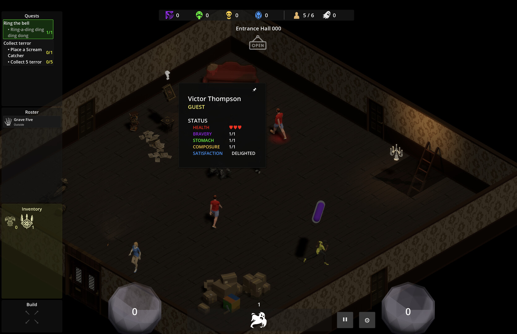 Build out your haunted house room by room. Place scare abilities, assign undertakers, and orchestrate the guest experience from an isometric view. Every room is a system. Every system can go wrong.