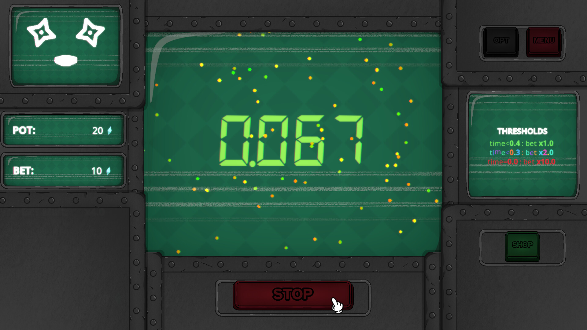 Train your timing skills to stop the clock close to zero, collect shards, and spend them on a massive skill tree in this short arcade-ish incremental game. Struggle with glitching displays, hidden timers, chaotic multi-stops, and other hazards as you improve your accuracy.
