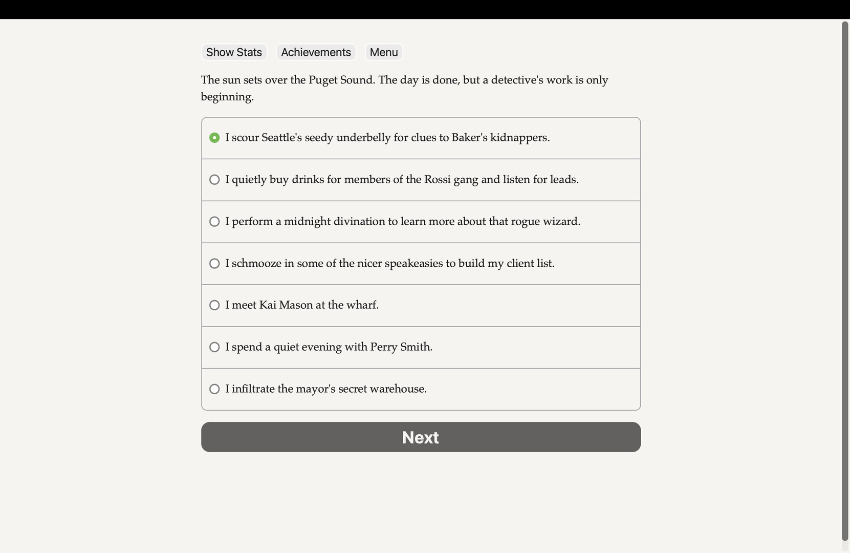 Sling spells and borrow trouble in a city full of bootleggers, bent coppers, and vampires. Can you save your partner before a wizard dooms Seattle? This game is a text-based fantasy noir.