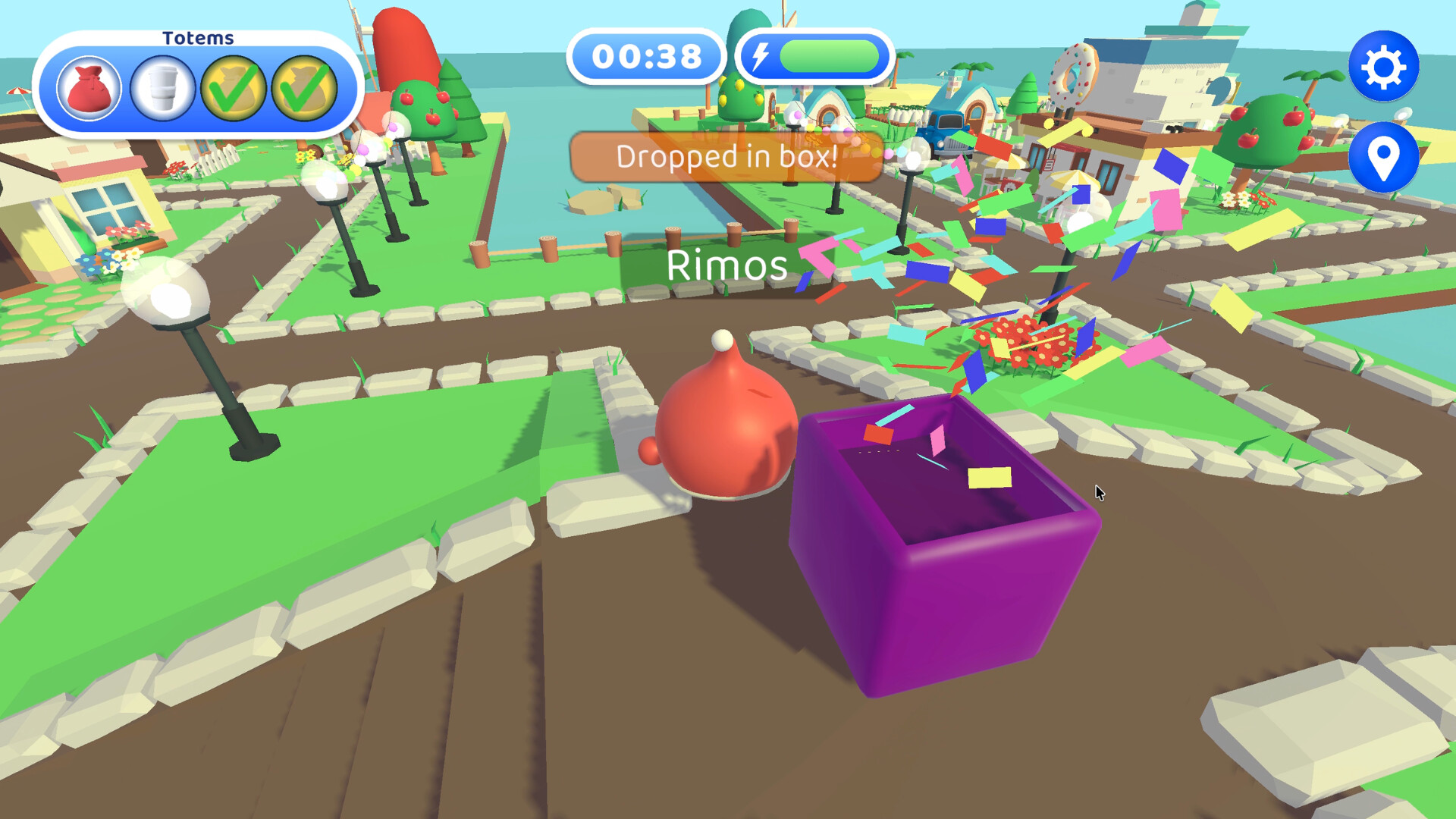 Totems shine when they are close. Follow the sound to find one, grab it, then drop it in the purple box.