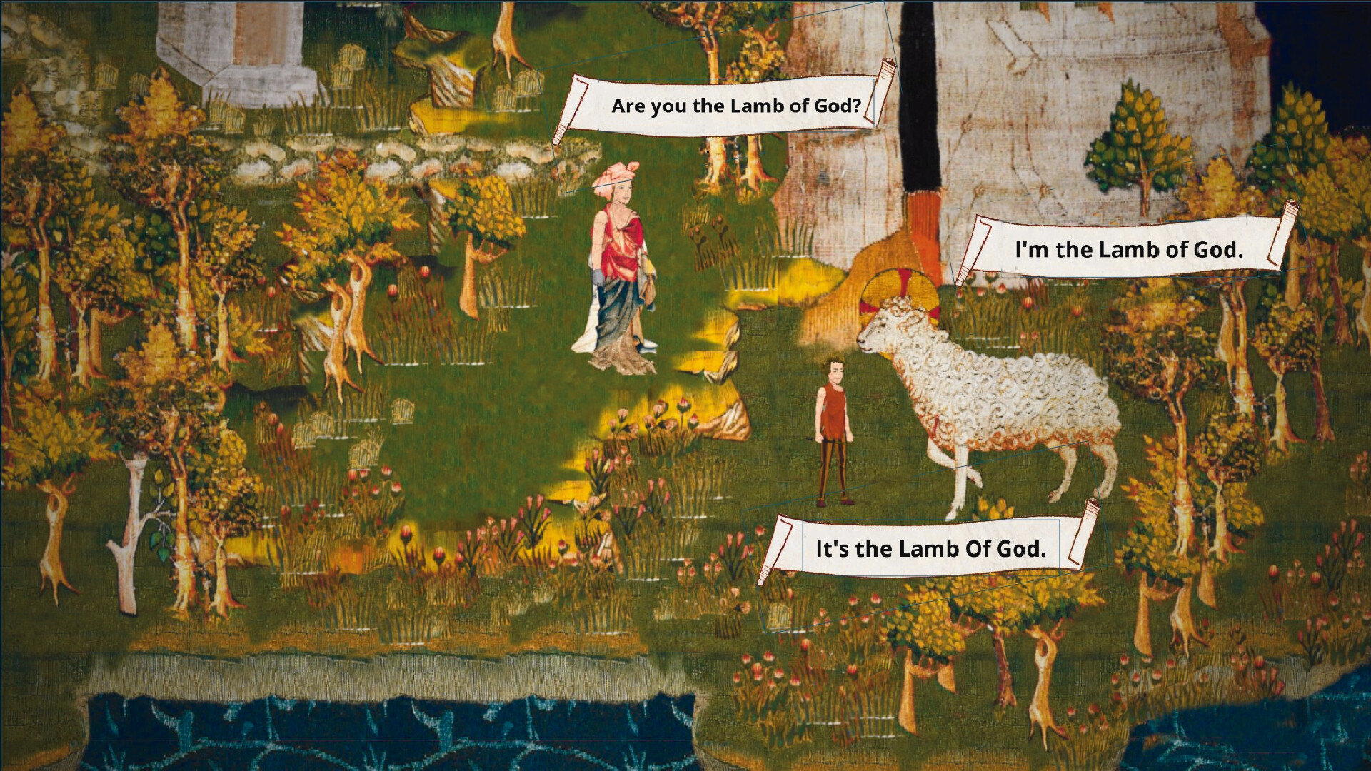 A unique and special style inspired by the breathtaking Apocalypse Tapestry (Tenture de l'Apocalypse). Woven stillness from the style of this medieval "comic" is brought to life and transformed into a historically very non-accurate adventure.