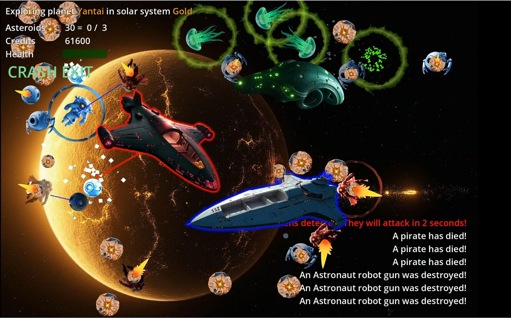 Explore space in three dimensions. Fight in two. Command astronaut and robot miners to extract gold from asteroids while surviving meteor storms. Battle pirates and aliens in fast-paced combat. Navigate 7 solar systems and 39 unique planets, unlock lost technologies, and rebuild humanity's future.