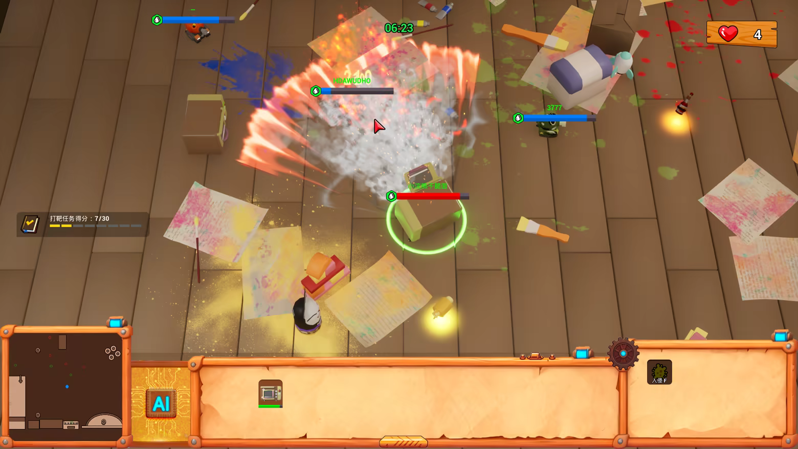 《坦克大作战》是一款1v4非对称对抗游戏,将RTS(即时战略)的运筹帷幄与TPS(第三人称射击)的动作射击完美结合,带来紧张刺激的策略对决。在游戏中,你可以扮演拥有上帝视角的失控AI,操控家电布下天罗地网;或者化身觉醒的玩具坦克,守卫家园协同作战。这场大作战,将在房屋的地板上决一胜负!