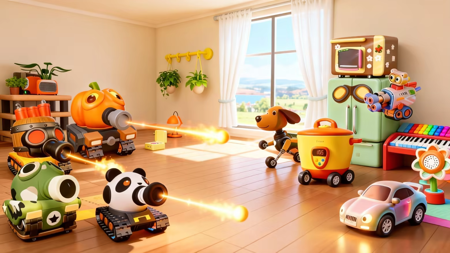 'Tank Battle' is a 1v4 asymmetrical combat game. In the game, you can play as a rogue AI with a god's-eye view, controlling household appliances to set traps everywhere; or become an awakened toy tank, defending your home and collaborating in battle. The epic fight is about to begin!
