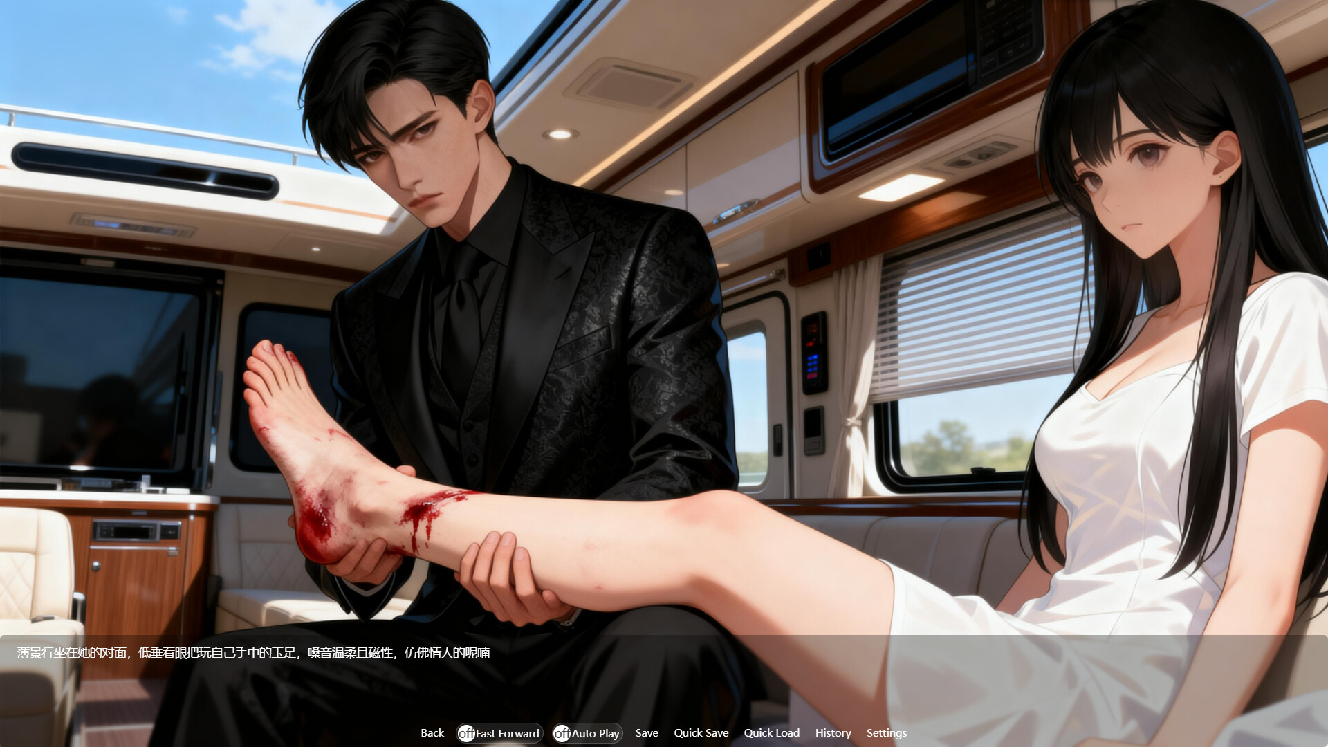 Adopting a realistic anime art style, the game meticulously portrays every emotional moment, from Bo Jingxing's menacing throne posture to Su Wan's tearful, helpless eyes. It covers four major scene types: a gloomy abandoned cruise ship, a luxurious private pool, a modern family villa, and a tense hospital clinic. Dynamic scene transitions, combined with changes in lighting and shadows, enhance the atmosphere of the story, such as the shocking scene of a villa fire illuminating the night.