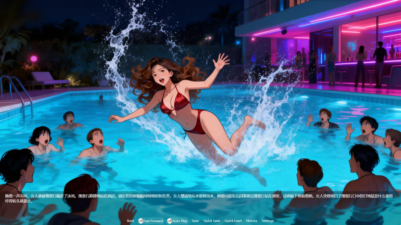 Luxury City: A private luxury pool, neon-lit atmosphere, a bikini party scene.