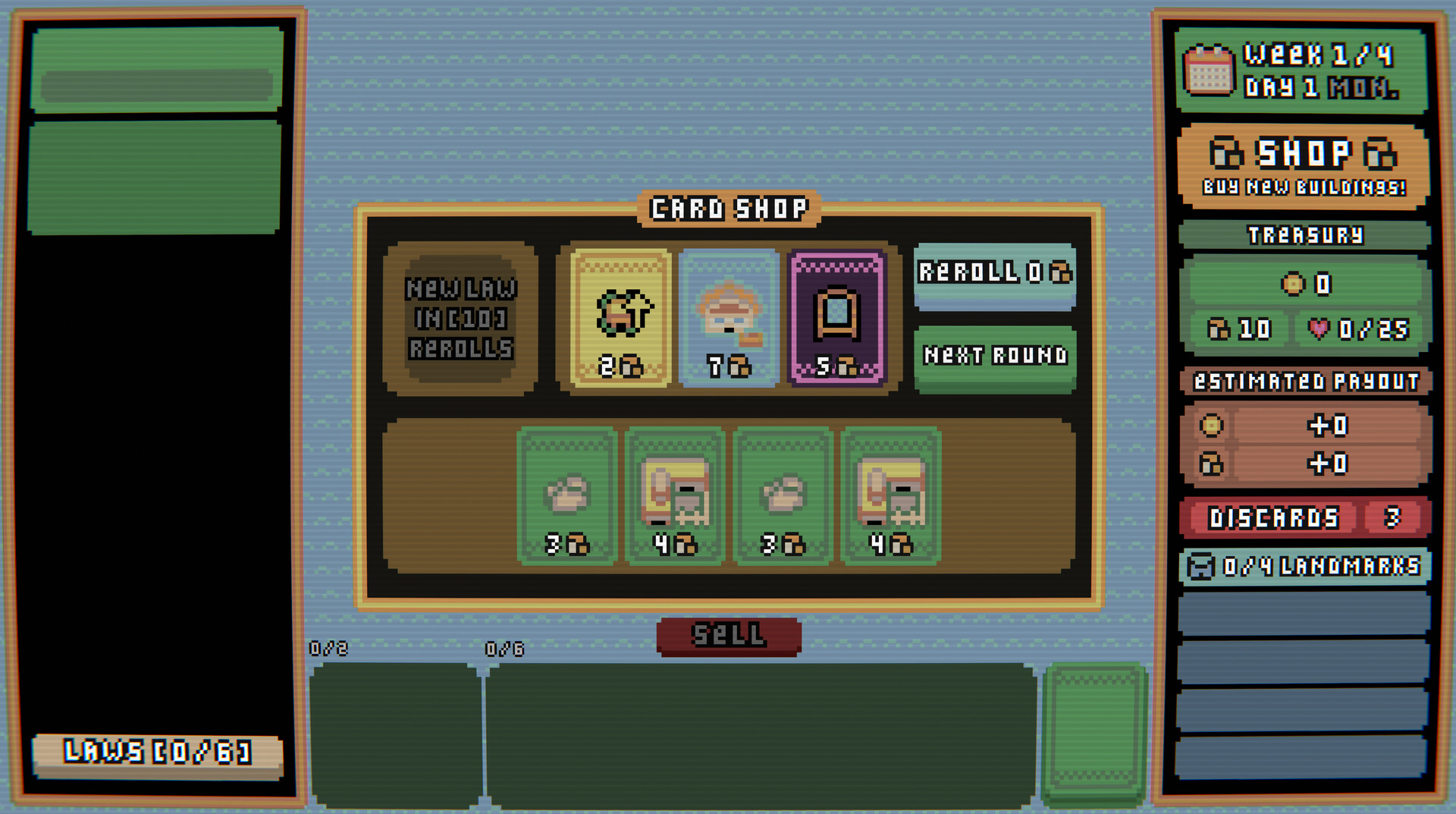 Upgradable Laws - Choose from 18 distinct laws, each with upgradable paths that permanently transform how your town functions mid-run. Strengthen existing strategies, impose new constraints, or radically alter your economy. As laws evolve, so does your gameplay strategy, forcing you to adapt your layout and rethink your priorities.
