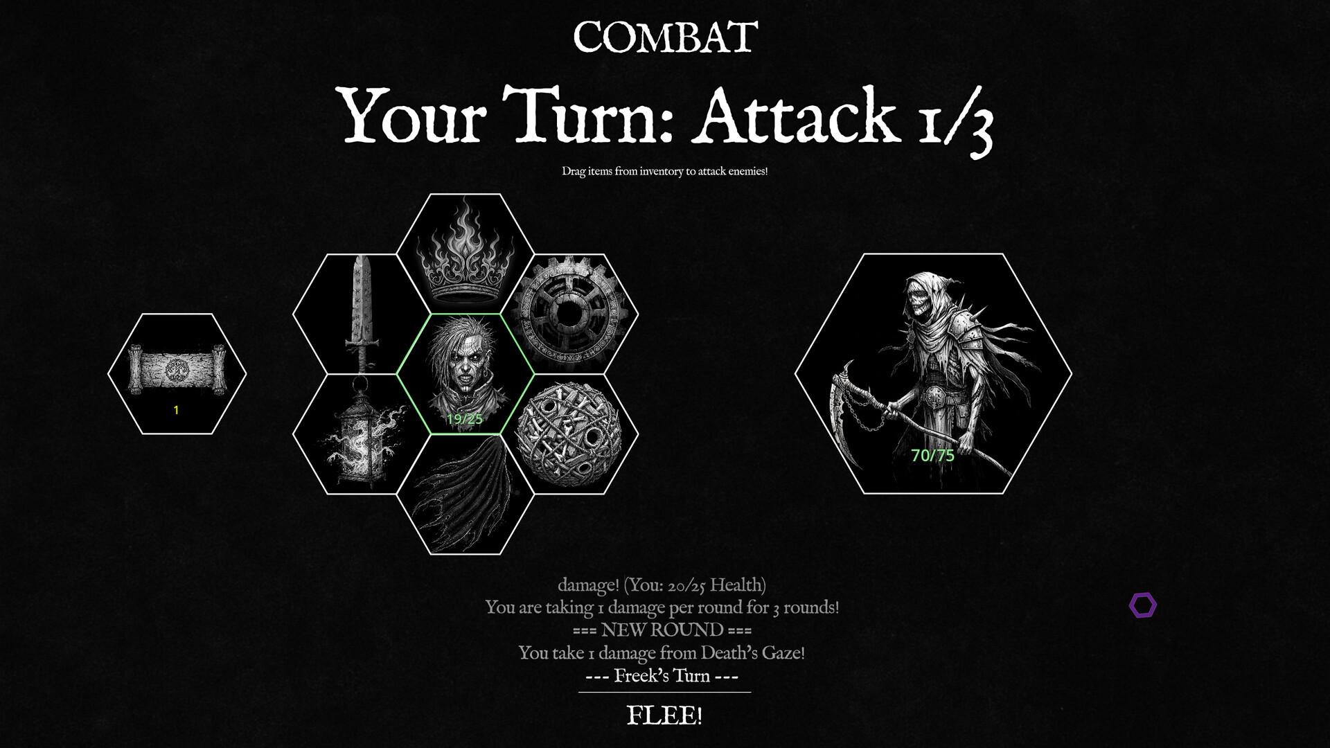 Terrain slows or strains you. Time passes. Hunger sets in. Random encounters—combat and non-combat—can reward you, wound you, or end the run outright. There is no safe route and no guaranteed progress, only judgment calls and their consequences.