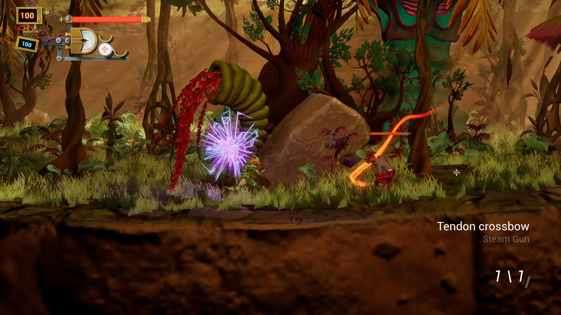 Fight with weapons inspired by steampunk and sci-fi universes, which you'll wield using a twin-stick shooter system (keyboard/mouse compatible). Manage your positioning based on your weapon's range, power, and firing style. Keep an eye on your magazines so you don't find yourself temporarily vulnerable during combat.