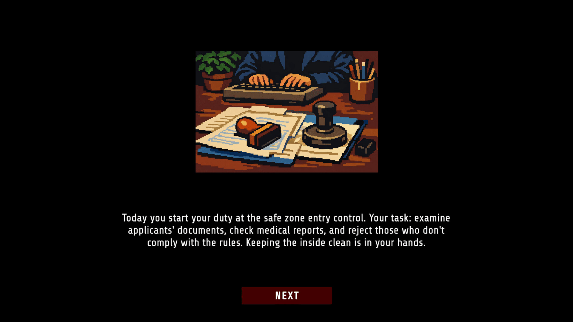 在疫情期間,你是醫院檢查站的一名人員,負責核准進入安全區域。審查身分證明、醫療報告與血液檢測;批准或拒絕申請。程序十分嚴格。決定權在你手中。