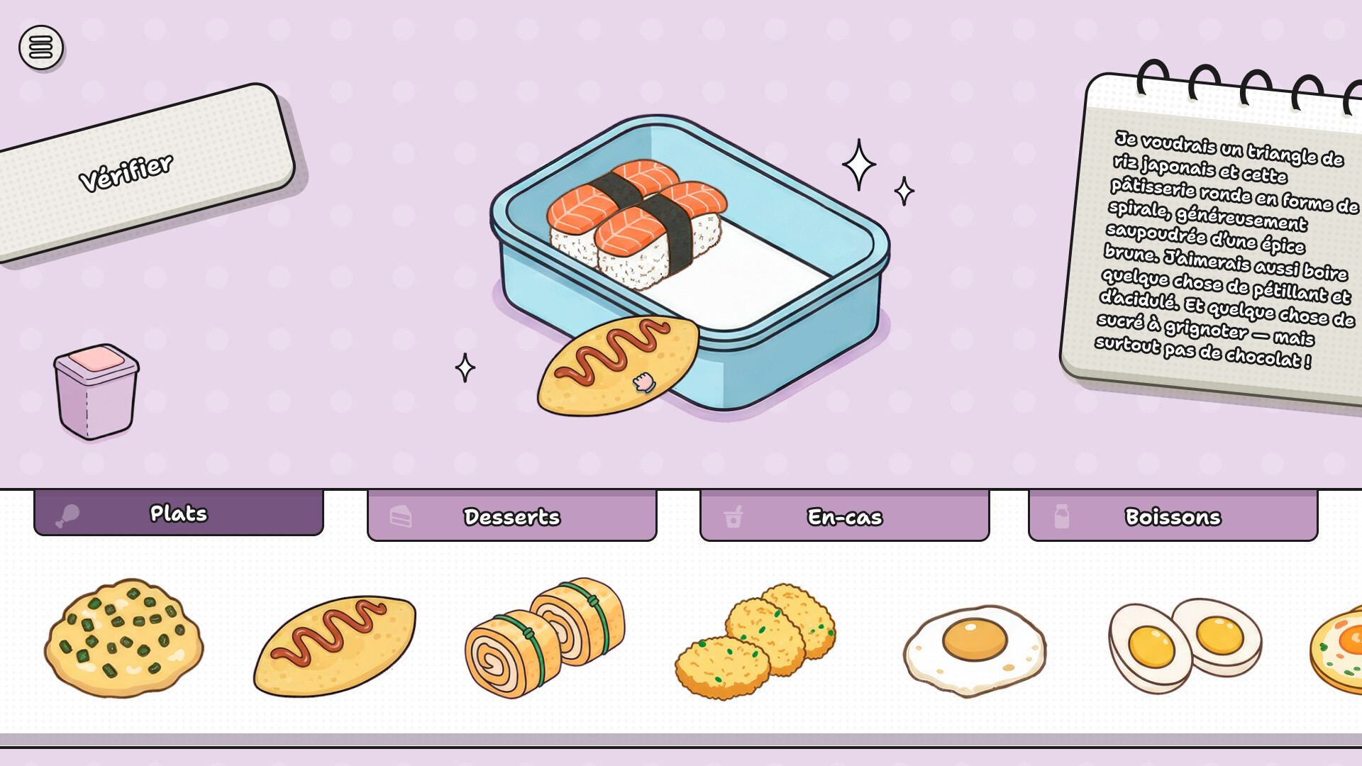 Pack my LunchBox est un jeu de réflexion mignon et relaxant dans lequel tu prépares des lunchboxes selon les demandes des clients ! Omelette aérienne ou riz bouilli ? Brioche à la cannelle ou cheesecake à la vanille ? Saucisse ou crevette tempura ? Que veut ton personnage aujourd’hui et que vas-tu mettre dans sa lunchbox ?