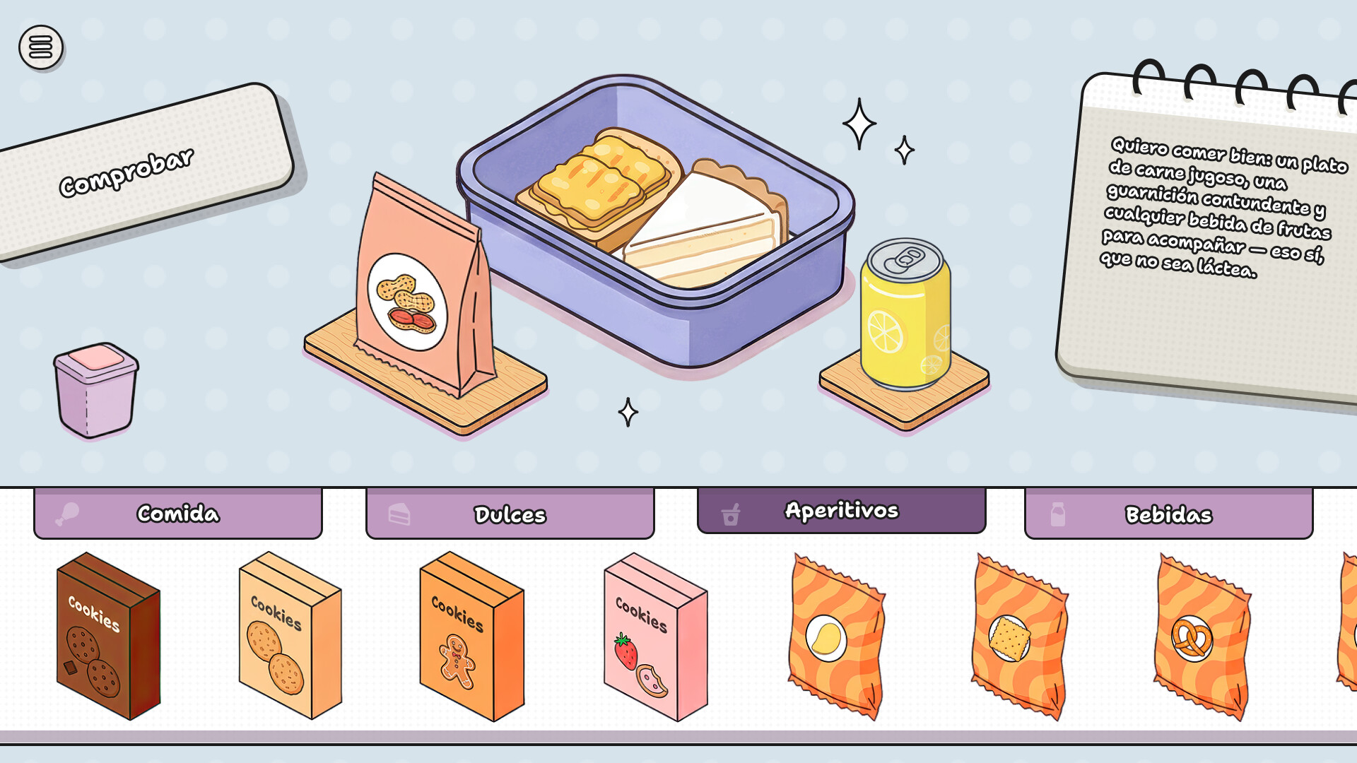 Cada pedido es una tarjeta con deseos, preferencias y exclusiones. Léela con atención y decide qué poner en la lunchbox. Elige productos de cuatro categorías: comidas, dulces, snacks y bebidas. Ten en cuenta los gustos del cliente, evita lo que no le gusta y arma el conjunto perfecto.