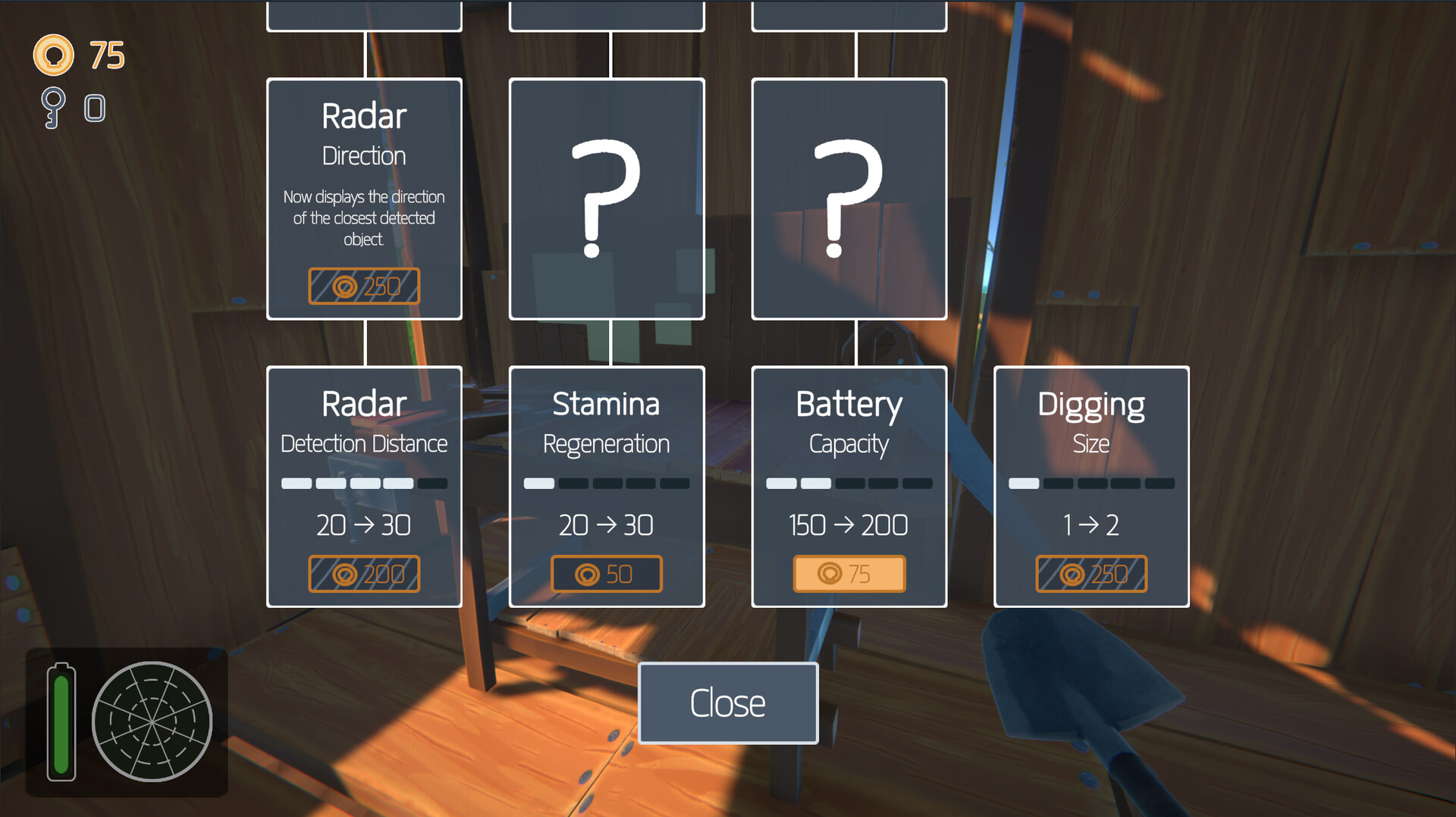 Use the money you make with the treasures to upgrade your equipement. Detect and dig better faster stronger!