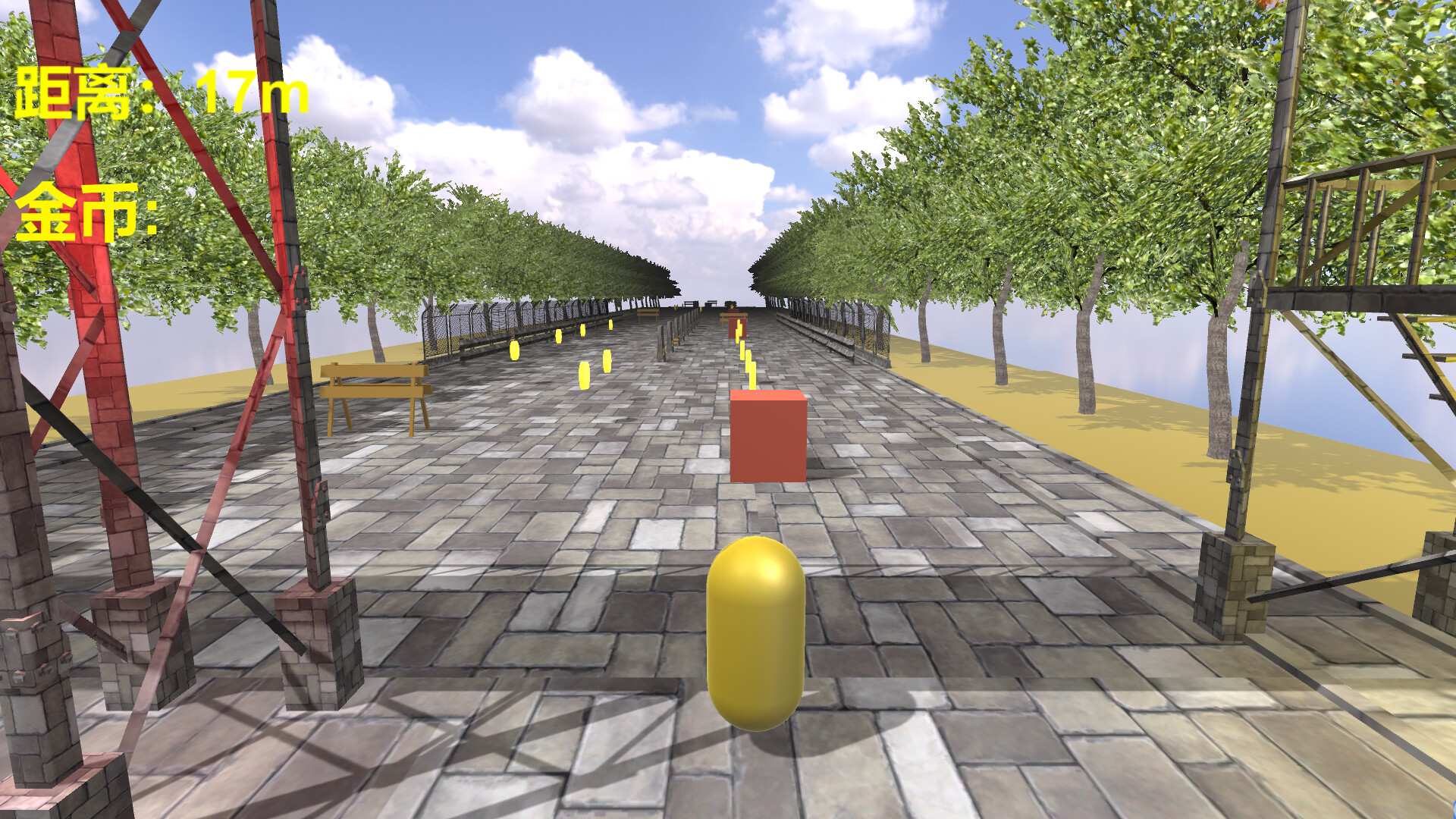 This is a fun casual running game where you control a golden capsule rolling forward on a cobblestone track. Your goal is to collect the glowing yellow coins along the way while avoiding obstacles like red blocks. You’ll also need to watch out for scene elements such as benches and scaffolding on both sides to avoid colliding and veering off the track.
