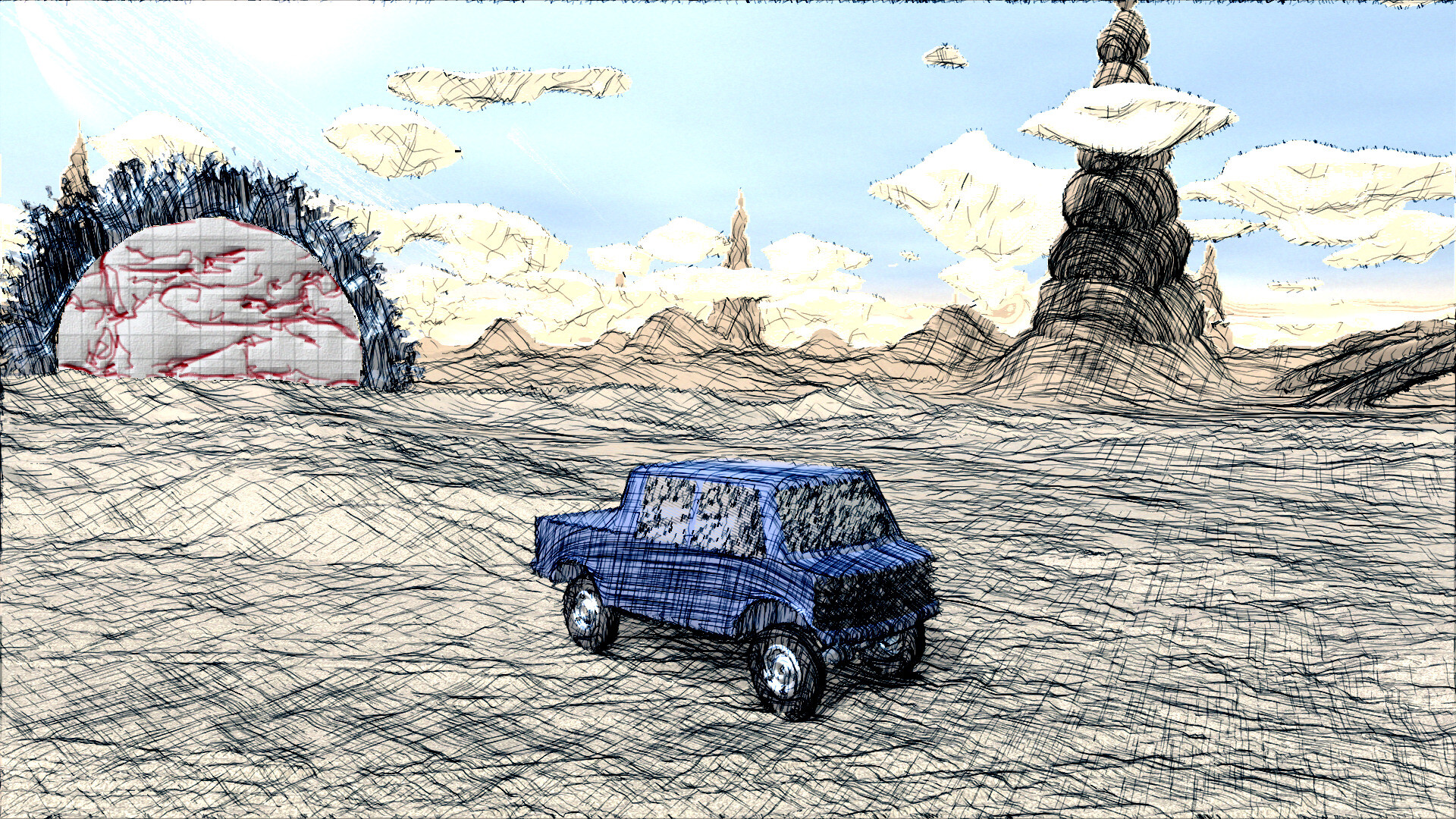 This is an utopic racing game situated on mars and other phantastic and odd worlds with portals leading to different visual styles. Race through ballpoint- and pencil-worlds, or even more abstract shadings.