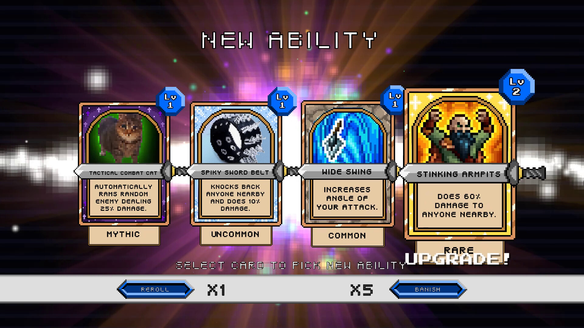 A true dopamine stimulator: Enemies explode in ecstasy upon seeing your sword! Perks that allow you to craft builds so crazy that even calculators can't keep up as you go and go from tens to millions in damage done. A vast arsenal of weapons with unique properties — from a laser-shooting sword to a meme cat that turns every fight into a vibrant spectacle!