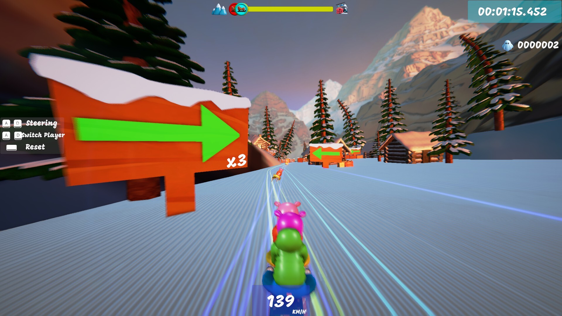 Race down icy slopes packed with sharp turns and unforgiving obstacles. A fast, chaotic co-op game built for speedrunners and friendship stress-tests.