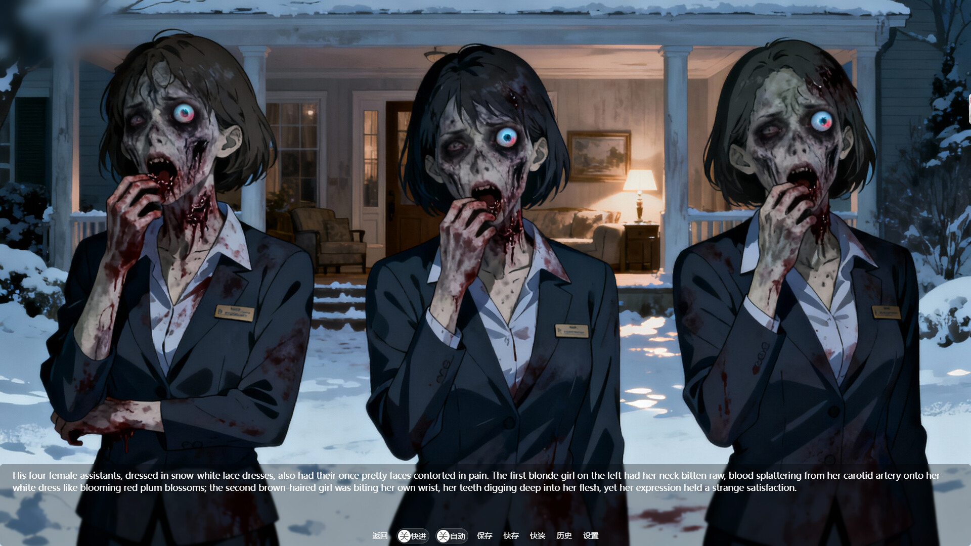Silver bells and screams intertwine as London is besieged by zombies on Christmas Eve! The FX organization uses alien genes to modify zombies, and the gentle florist girl, Katherine, becomes the zombie mother. Kyle, who secretly loves her, chooses to protect this special "prey" amidst the devastation of his family's deaths. Will he awaken her humanity, or be consumed by the virus? This adventure, concerning family, love, and the survival of the world, is your choice!