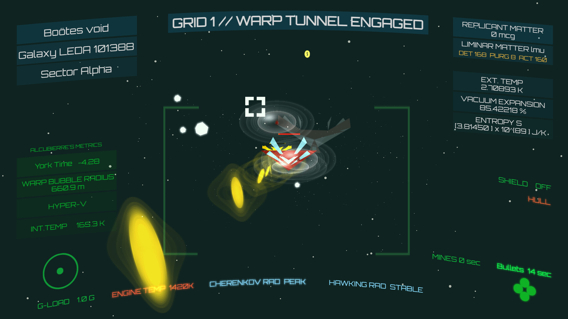 Navigate within an Alcubierre warp bubble, monitoring every parameter on your HUD; everything has a meaning.