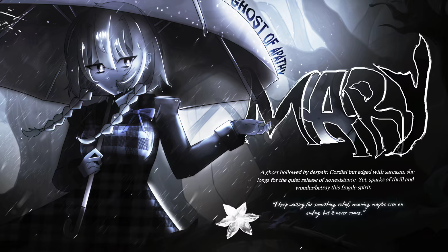 Mary: A fragile but sharp orphan pianist, resigned to despair but harboring sparks of hidden thrill. The rain is heavier than usual tonight.